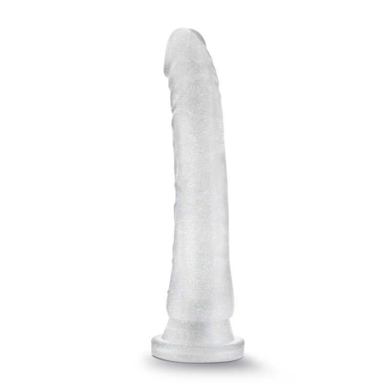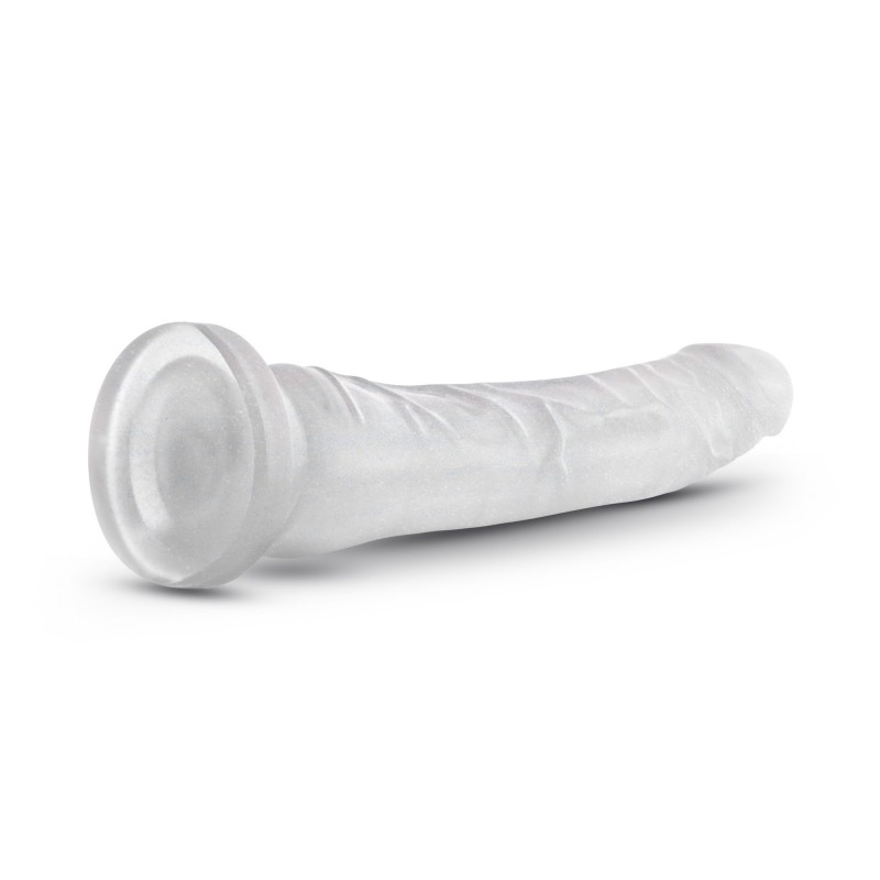 The bright blue Sweet N' Hard 6 has 8 inches insertable that has a realistic phallic shaped 1.25 inch wide head that leads to a 2 inch wide veined g-spot curved shaft. Or partner up for strap-on harness fun! The sturdy 2.5 inch wide suction cup sticks to most flat, smooth surfaces and allows it to stand up on its own for solo play in the shower or the kitchen. It comes in cotton candy pink.