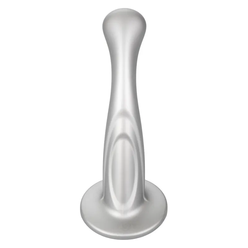 This silver dildo sports a regal, curved shape with a bulbous tip for deep, internal G-spot or P-spot stimulation and a strong suction cup base for hands-free fun. It mounts securely to most flat, solid surfaces and is also harness-compatible if you're in the mood to share the fun with your loyal subjects!