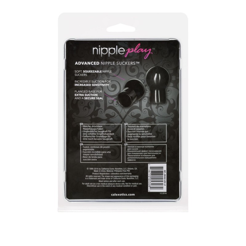 Indulge in erotic stimulation up top with the discreet Nipple Play™ - Silicone Advanced Nipple Suckers™! Sucking thrillingly at any particularly sensitive bit of skin, California Exotic's nipple play collection presents the Nipple Suckers, a duo designed for simple, quick attachment and blissfully stimulating results.