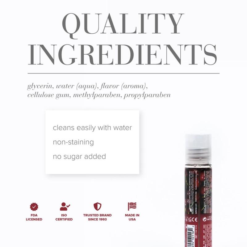 JO H2O Cherry Burst flavoured lubricant lets you enjoy juicy blasts of cherry sweetness. Featuring a water-based lube and the added delight of a rich cherry flavour, its sensual, comforting glide and silky-smooth feel are perfect for any intimate moment, particularly oral play. And when youโre done, it cleans off easily and leaves your skin feeling soft and moisturised.
