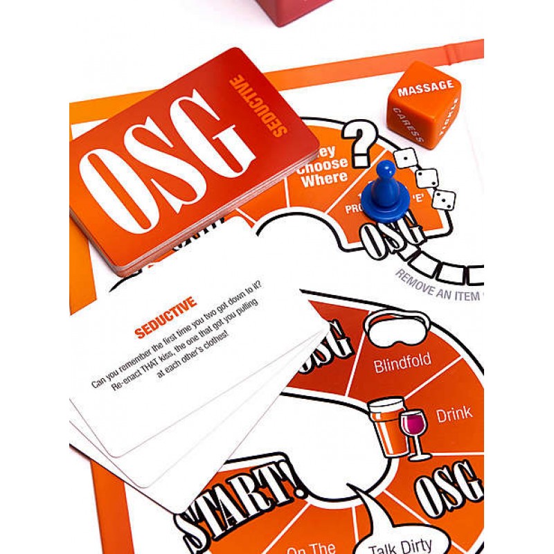 On a board that sensually spells out S E X, pleasure intensifies from Seductive to Erotic and onto X-rated as you advance from one letter to the net. With each progressively steamy level, roll to discover what you’ll be doing, where you’ll be doing it, and who reaps the rewards! The board is also loaded with OSG squares where you get to select a card describing increasingly sexy scenarios and intimate actions.