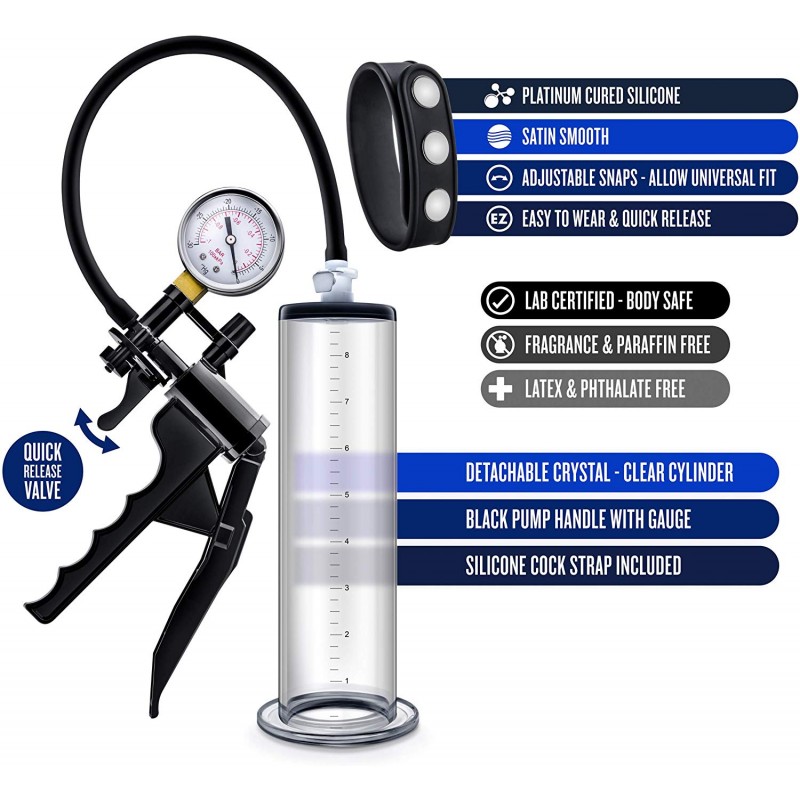 The Blush Performance VX8 Vacuum Penis Pump is a professional-grade pump with an airtight cylinder for suction. The air pressure gauge and clear acrylic cylinder let you measure your progress every step of the way. Designed to maximize your natural length and girth, the Performance VX8 can also bring heightened sensitivity. It includes a cock strap to keep your engorgement in place for up to 30 minutes after pumping.