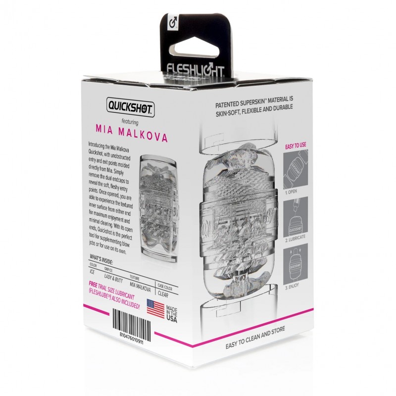 The Fleshlight Quickshot Mia Malkova boasts an open-ended, dual-orifice design, teasing you with both Butt & Vagina SuperSkin textures. Feel the tender embrace, as natural as the real thing, making you question where reality ends and fantasy begins.