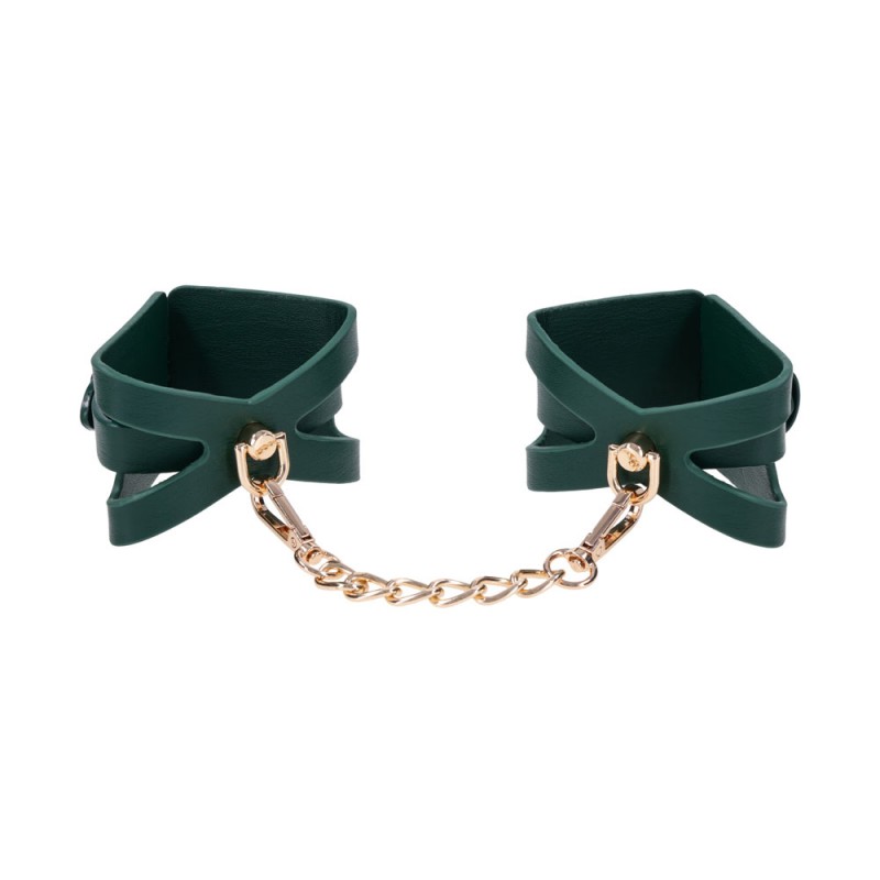 Get wrapped up in something irresistible. These emerald green sexy cuffs feature dramatic cutout detailing to reveal more skin and spark more intrigue. Lined for softness and designed for visual seduction, they’re as comfortable as they are commanding. Use them to bind wrists together or attach to other Indica items for a coordinated scene. The gold chain and hardware add just the right touch of luxury to every surrender.
