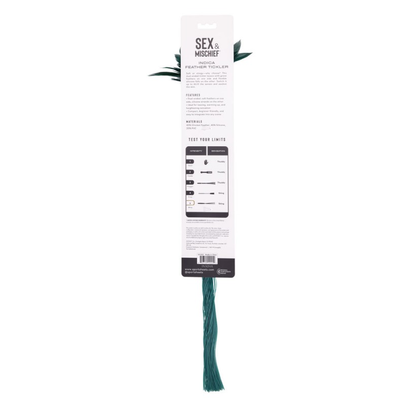 Explore the art of contrast. The Indica feather tickler is a dual-ended tool that teases and tantalises with every stroke. One side features soft green feathers for delicate sensory play, while the other delivers a light sting with flexible silicone falls. Use it to awaken nerve endings, set the mood, or surprise your partner with an unexpected switch in sensation. It's a two-in-one treat designed for touch you won't forget.
