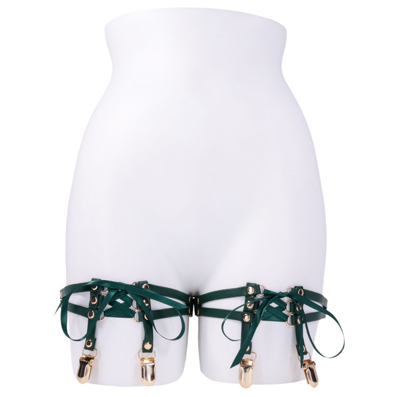 Add a hint of bondage to your lingerie. The Indica Laced Up Garters wrap your thighs in emerald faux leather and tie closed with silky green satin laces for a corset-inspired fit. Adjustable from 45 cm to 66 cm, these garters hug the body just right—enhancing curves, stocking security, and seductive confidence. Whether worn under clothing or as part of a scene, this bondage lingerie guaranteed to turn heads.