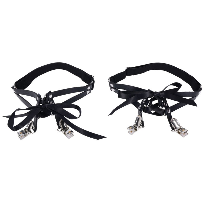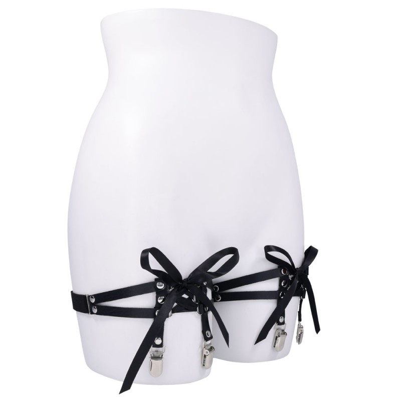 Turn heads and capture hearts with these flirtatiously elegant garters, featuring a sultry lace-up corset design. Black satin ribbon weaves through the faux leather panels, offering an adjustable fit that contours your thighs with seductive precision. A secure clip keeps your thigh-high stockings perfectly in place, while the fusion of bold structure and soft satin strikes the perfect balance between edgy and romantic. Designed to make a statement, the Laced-Up Garters empower you to embrace your daring side and indulge in moments of sensual confidence.