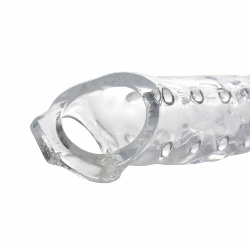 All you do is slide your penis into this extender and enjoy the benefits of extra girth and length as wellas a longer lasting erection. It doesn't matter if your hard or flaccid, this extender will be able to help you penetrate and pound your partner. The sheath has a 1.5 inch unstretched inner diameter with 6 inches insertable that is lined with pleasure nubs, for stimulation with each stroke. Also, the semitransparent design means things can be easily admired. The 1.4 inch ball ring also has a perineum massager that can be trimmed for comfort.