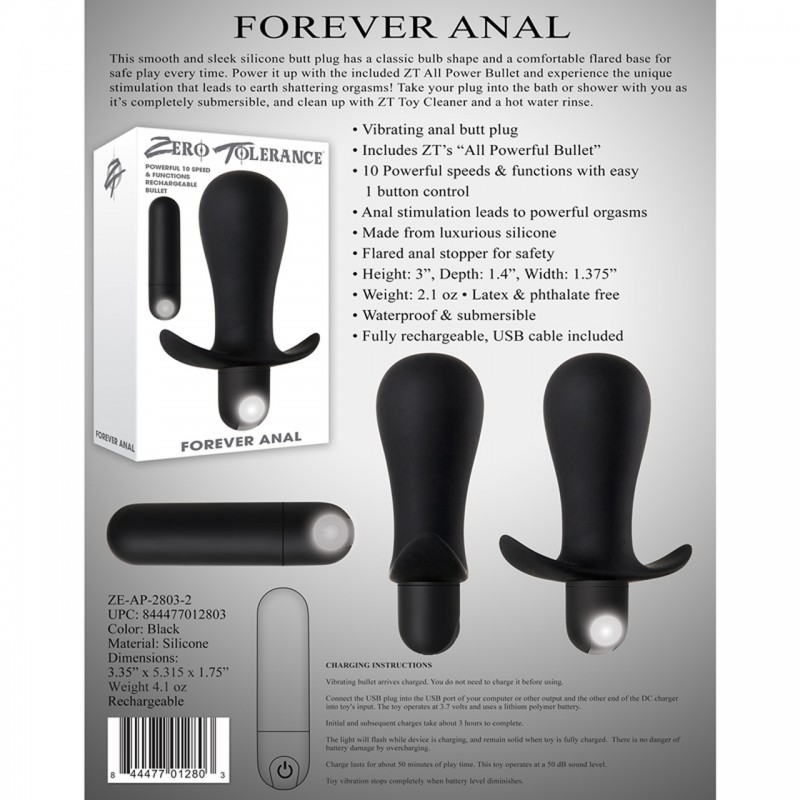 Vibration comes courtesy of a full-sized bullet vibe slipped through the base. Hit the single power/function button to explore each vibration option at your leisure. Conveniently USB rechargeable, Forever Anal's core bullet powers up using the included charge cable.